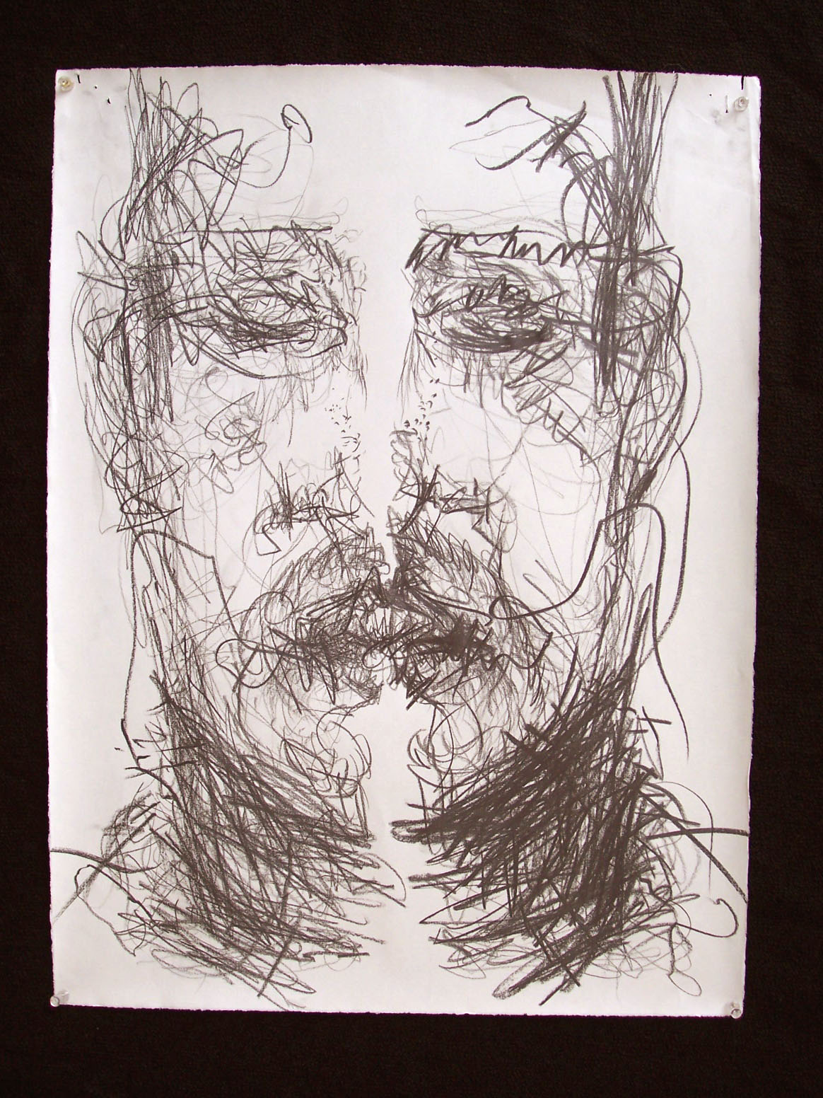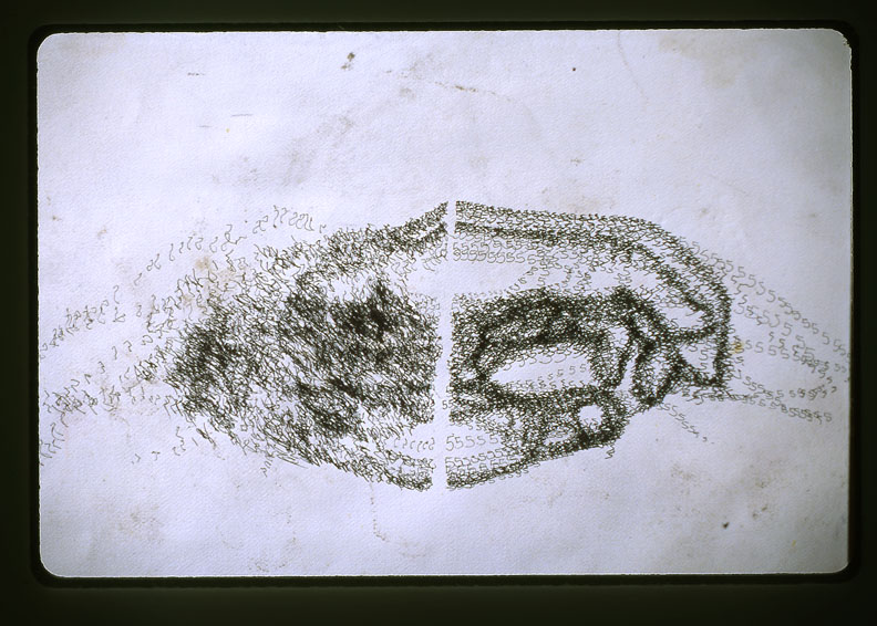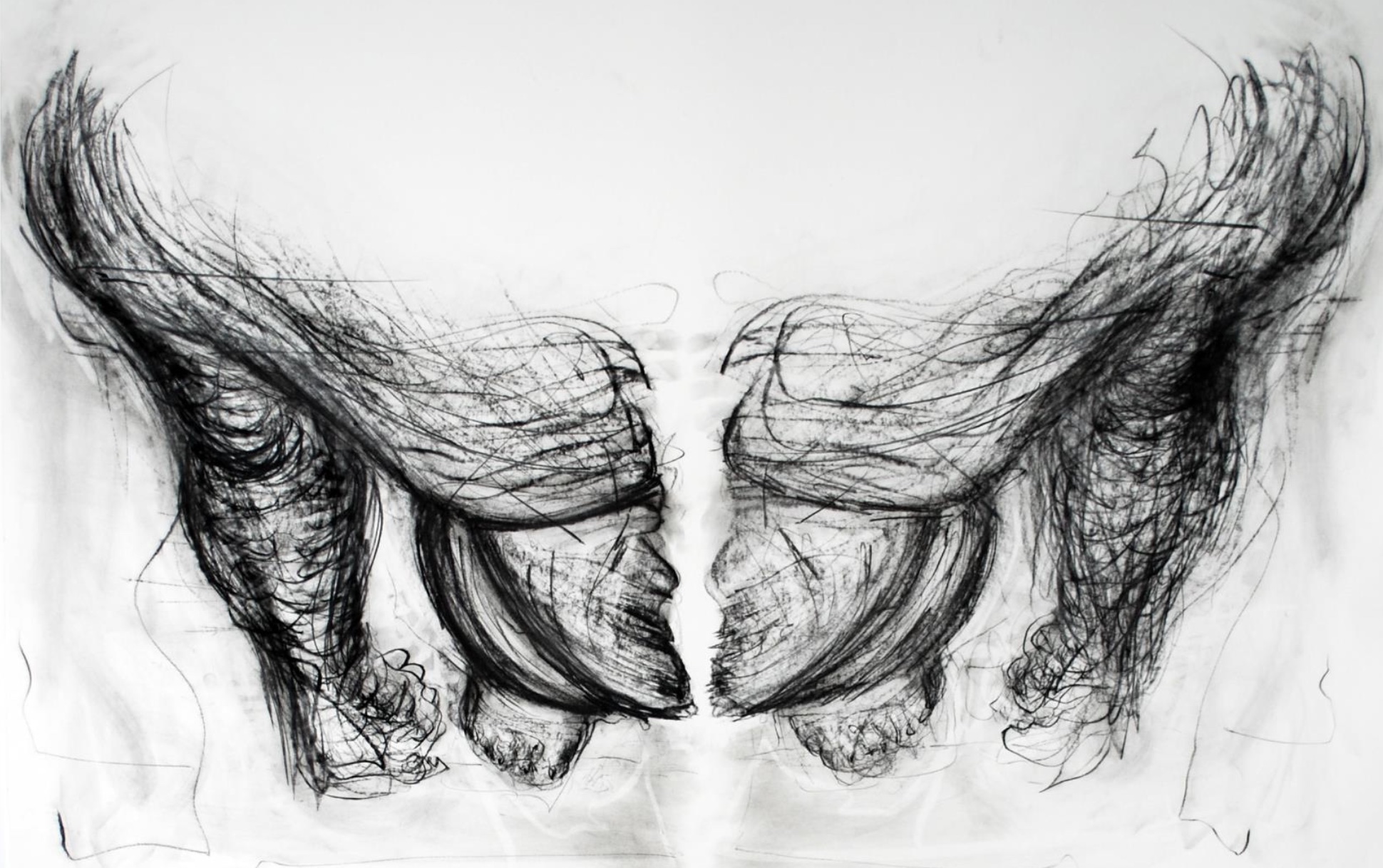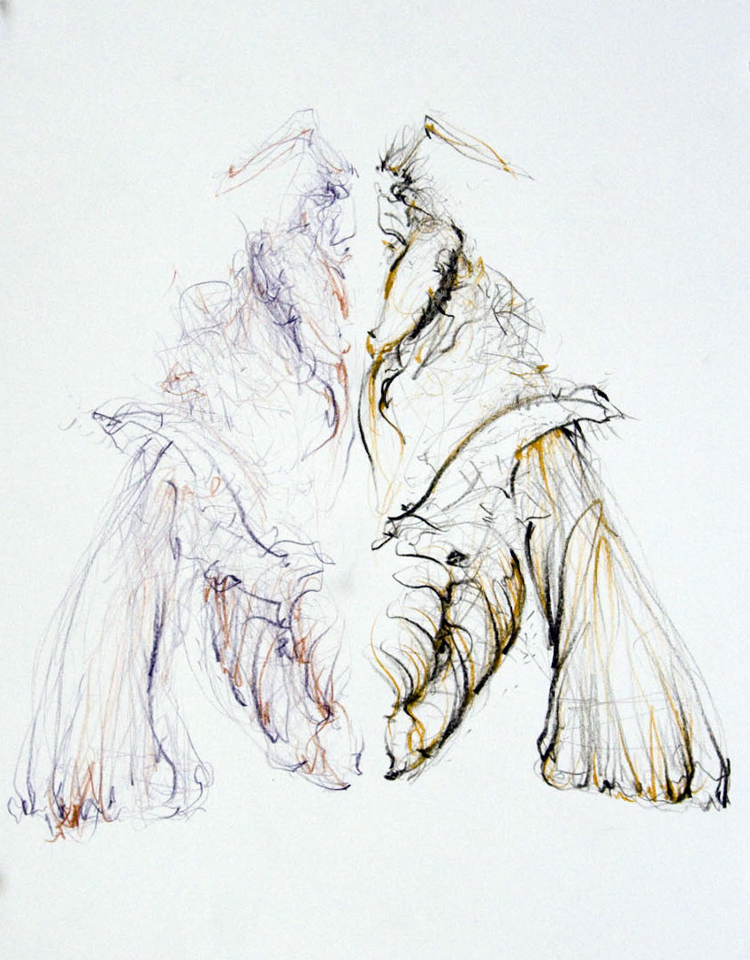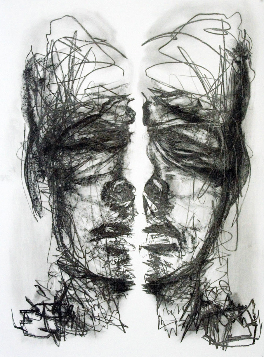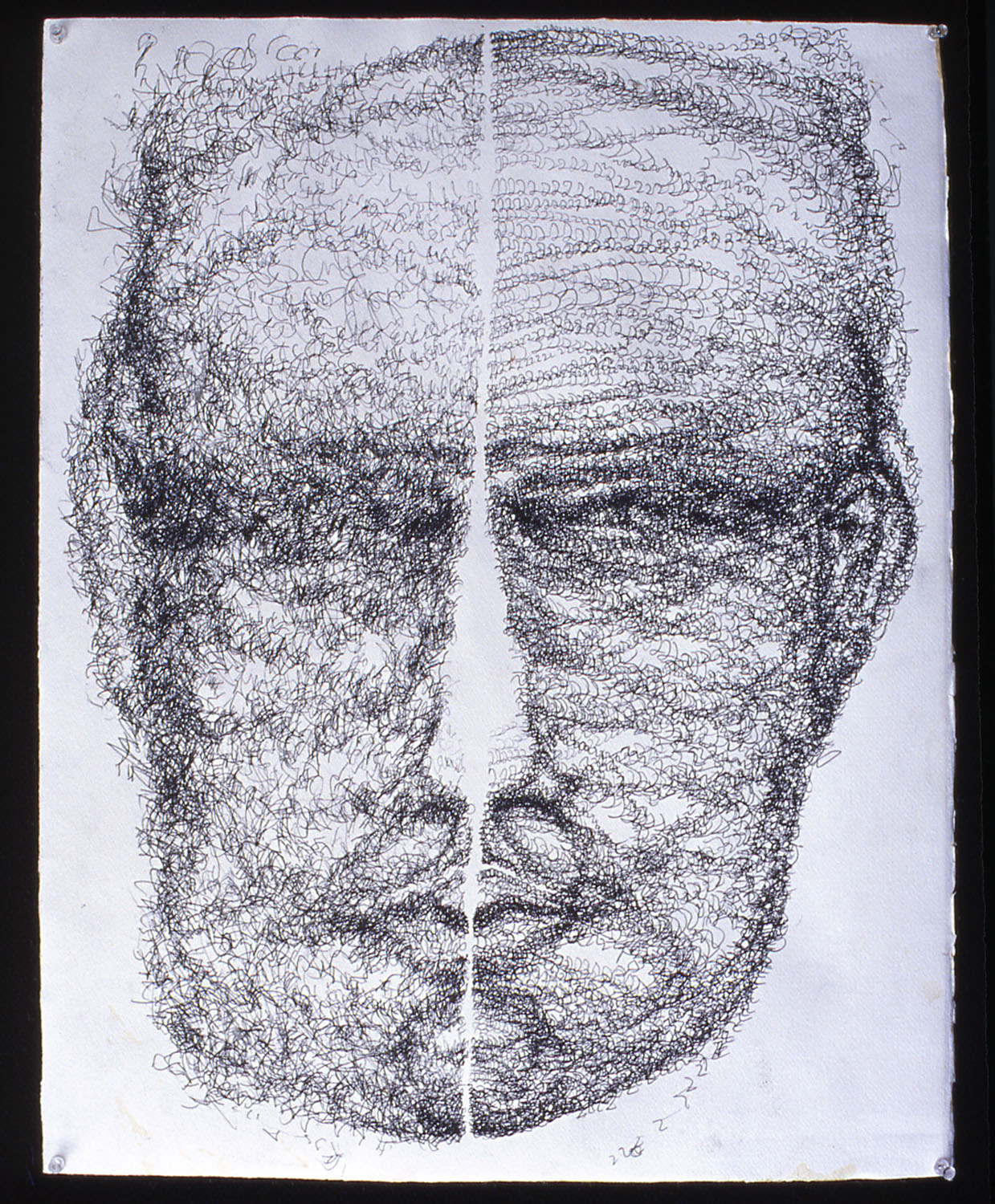 These drawing were executed with my left and right hands simultaneously. The marks from each hand are separated by the empty space running vertically through the center of the paper. This approach to drawing was stimulated by working with sound. The act of listening is a binary activity where both ears transmit similar but distinct reflections of wave vibrations deciphered in the inner ear. The concert of information discloses direction, speed, texture, and ultimately our location. After many months relying exclusively on two ears to experience the environment I returned to drawing with one hand. Immediately this traditional approach produced seasickness the kind I felt as a child ferry crossing through the rising and falling waters off the coast of Scotland. Drawing with both hands returned a sense of equilibrium to the act of drawing. This binary approach produces similar but distinct reflections of what my senses apprehend.