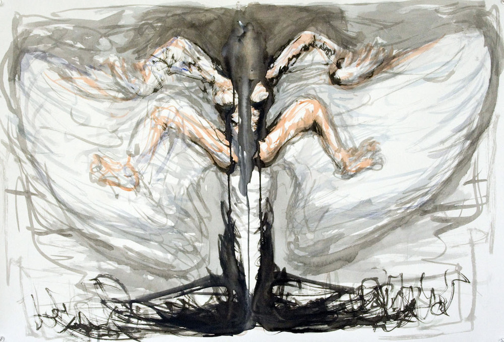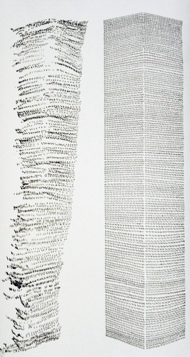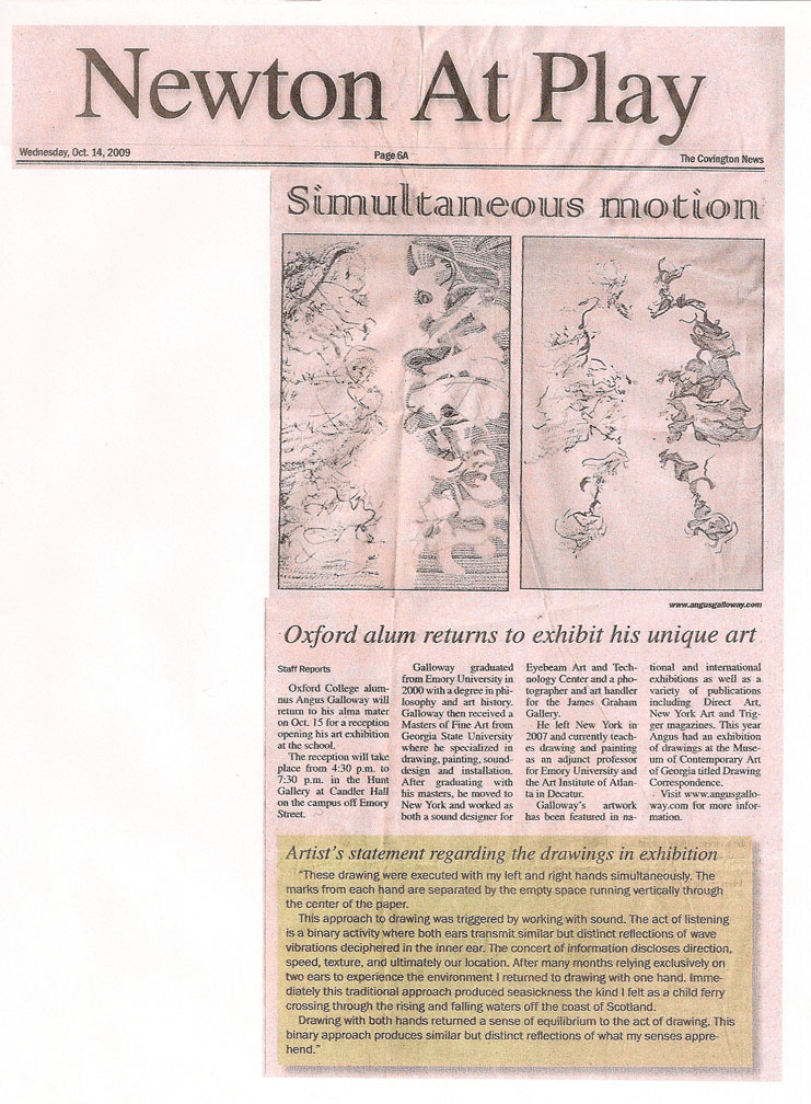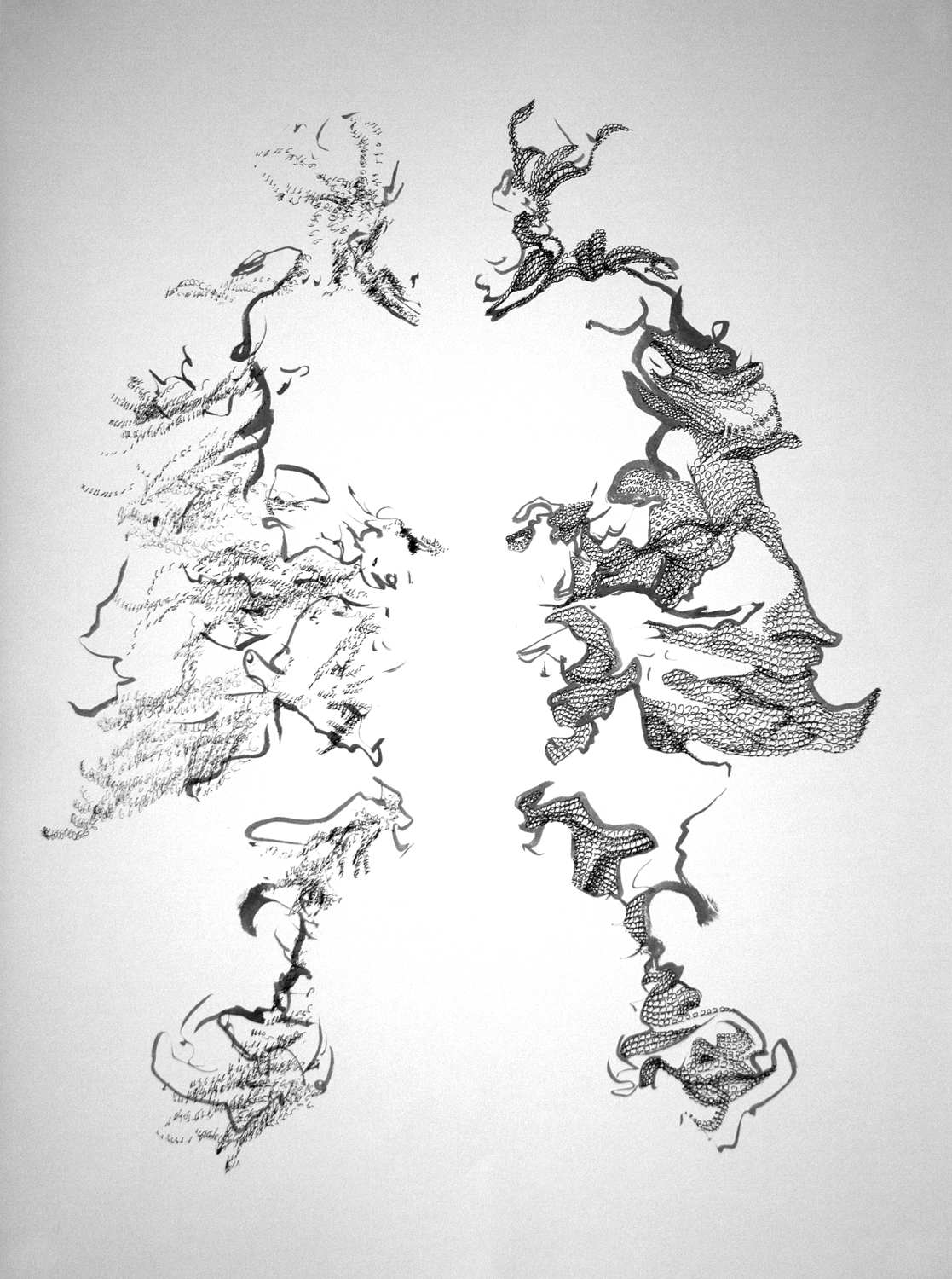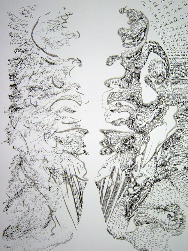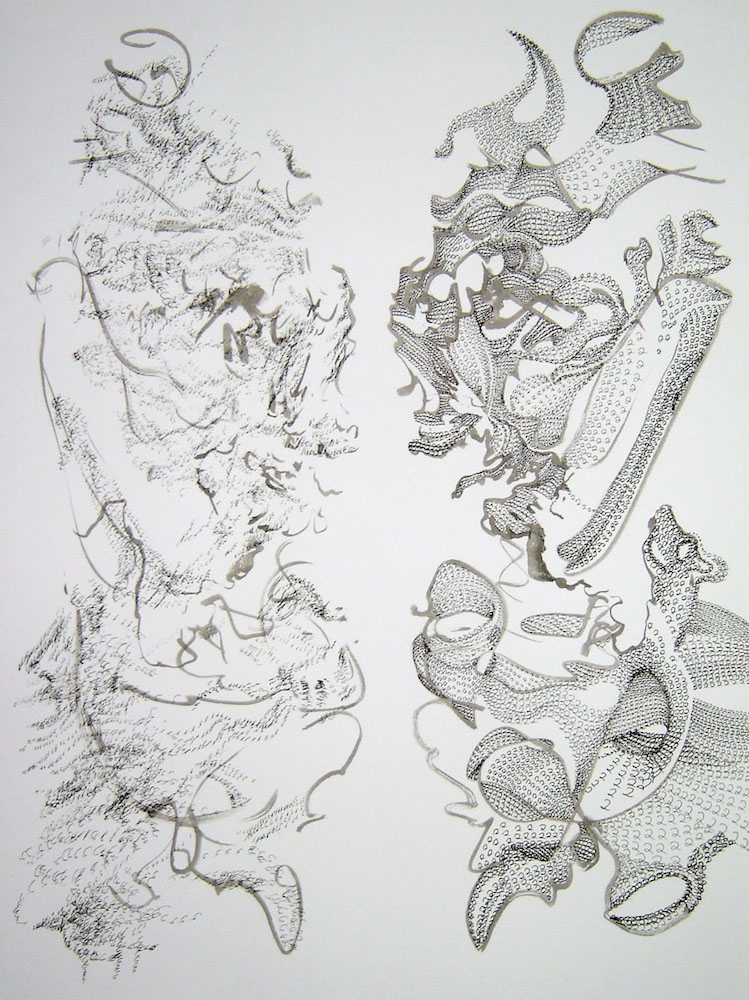 These drawing were executed with my left and right hands simultaneously. The marks from each hand are separated by the empty space running vertically through the center of the paper. This approach to drawing was stimulated by working with sound. The act of listening is a binary activity where both ears transmit similar but distinct reflections of wave vibrations deciphered in the inner ear. The concert of information discloses direction, speed, texture, and ultimately our location. After many months relying exclusively on two ears to experience the environment I returned to drawing with one hand. Immediately this traditional approach produced seasickness the kind I felt as a child ferry crossing through the rising and falling waters off the coast of Scotland. Drawing with both hands returned a sense of equilibrium to the act of drawing. This binary approach produces similar but distinct reflections of what my senses apprehend.